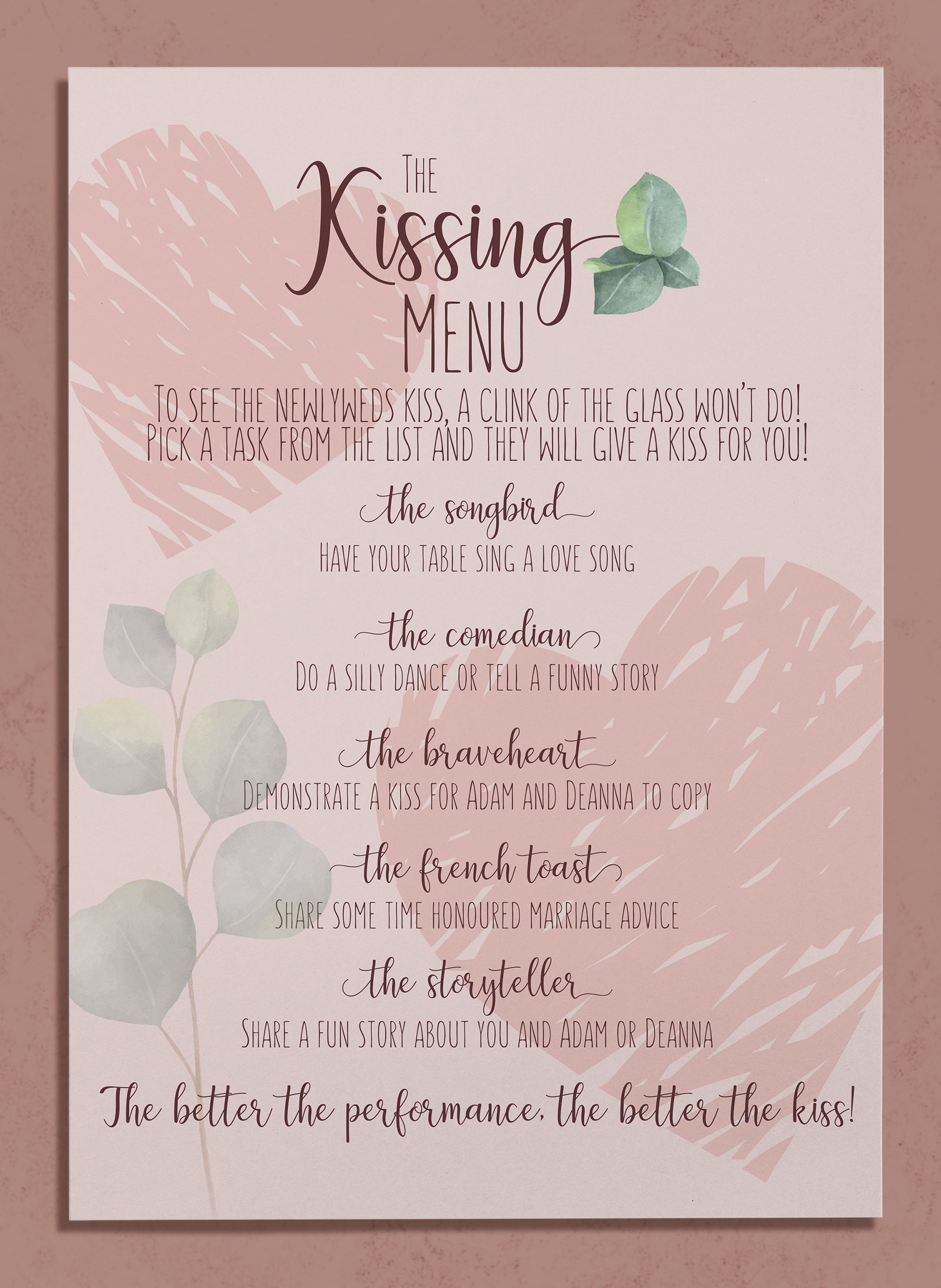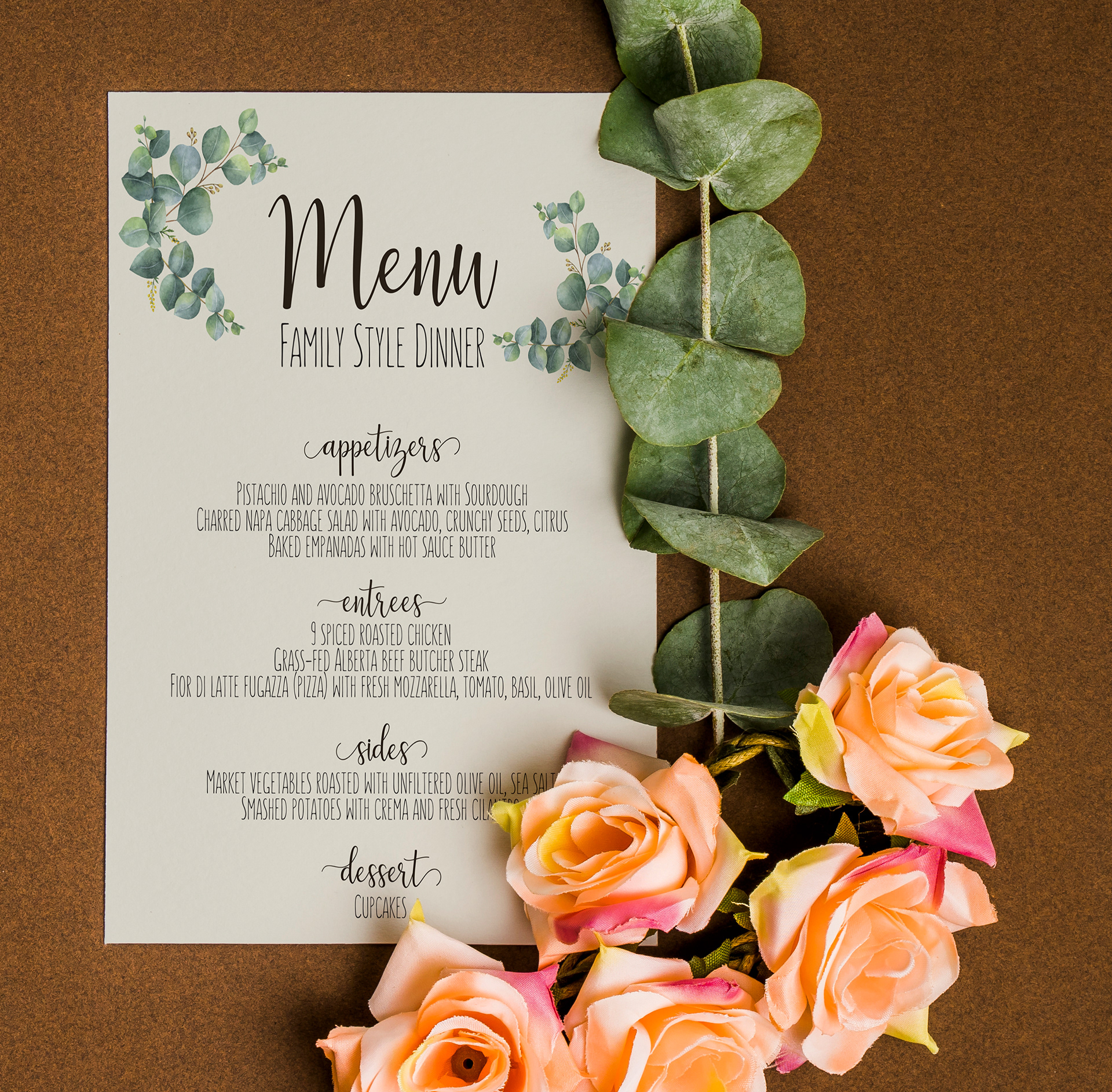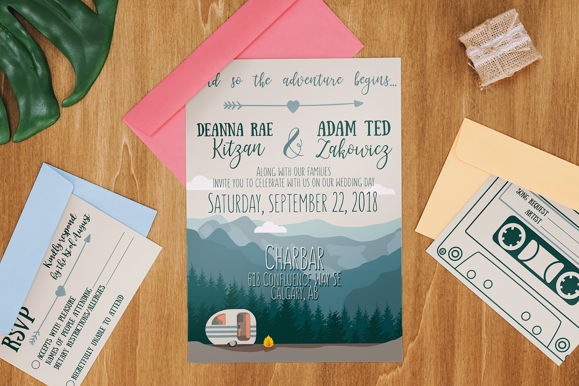 Full wedding stationery design. Menu, invitation, RSVP card, and signage.
